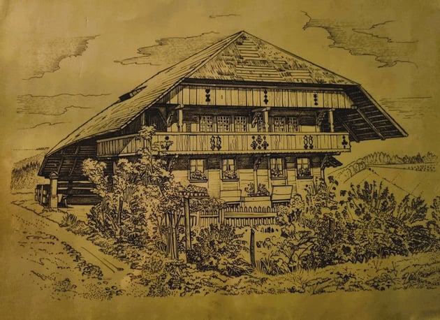 Ein alter Stich zeigt die zauberhafte Schönheit des alten Taunerhauses, in welchem Verlegerin Verena Zürcher mit ihrer Familie lebt und es gerne ab und zu für Gäste öffnet (kulturelle Anlässe wie Lesungen, Kindertheater, Umweltbildung, etc.).